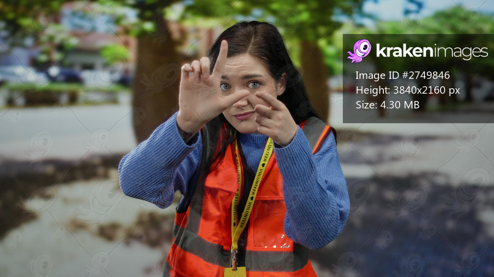 Woman in orange vest makes loser gesture on street showcasing outdoor volunteer work with brunette hair and urban background.
