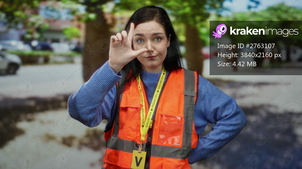 Woman in orange vest makes loser gesture on street showcasing outdoor volunteer work with brunette hair and urban background.