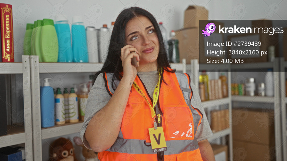 Woman in orange vest talking on phone in charity donation center with shelves of supplies in the background.