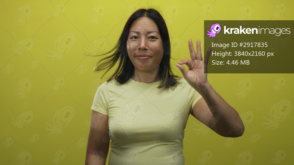 Woman in pale yellow tee showing ok sign with right hand and smiling against bright yellow studio wall; confidence warmth optimism.