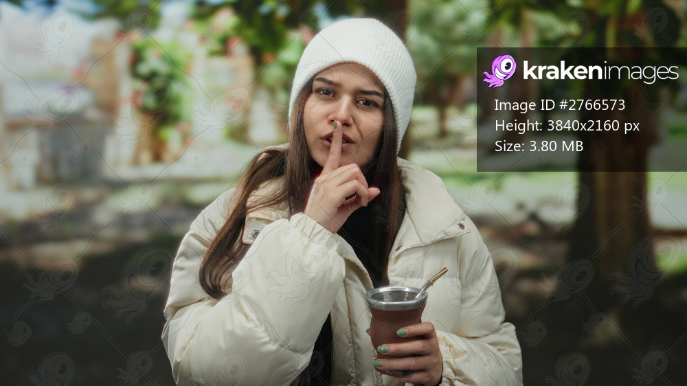 Woman in park gestures silence wearing white hat and coat holding drink outdoors in serene natural setting implying quiet contemplation and peaceful atmosphere. - Kraken Images