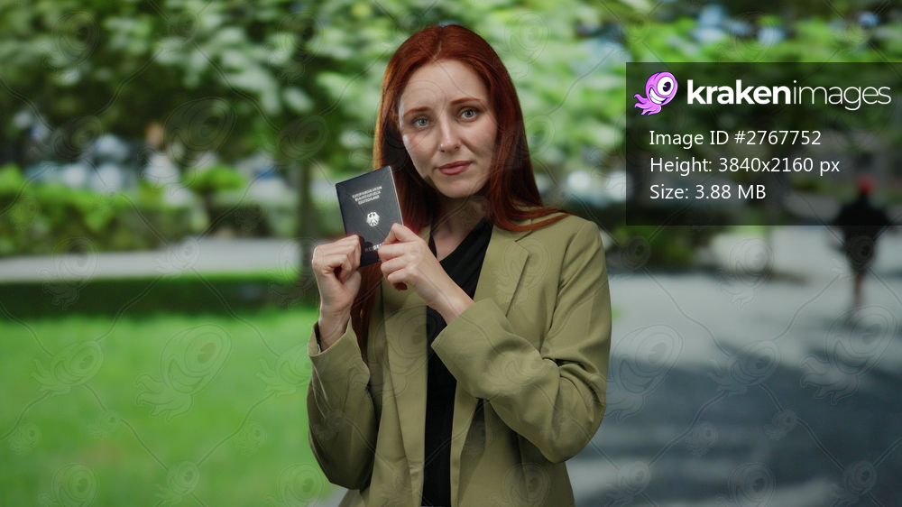 Woman in park holding german passport, showcasing travel excitement with thoughtful expression amid vibrant greenery.