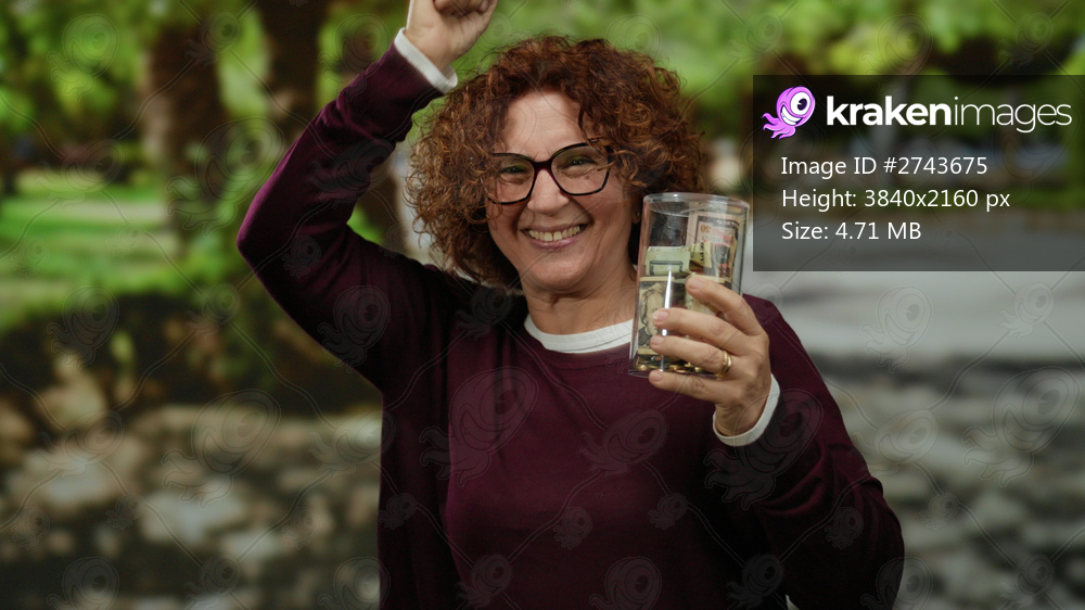 Woman in park holding glass jar filled with american dollars while smiling energetically under sunny outdoor surroundings.