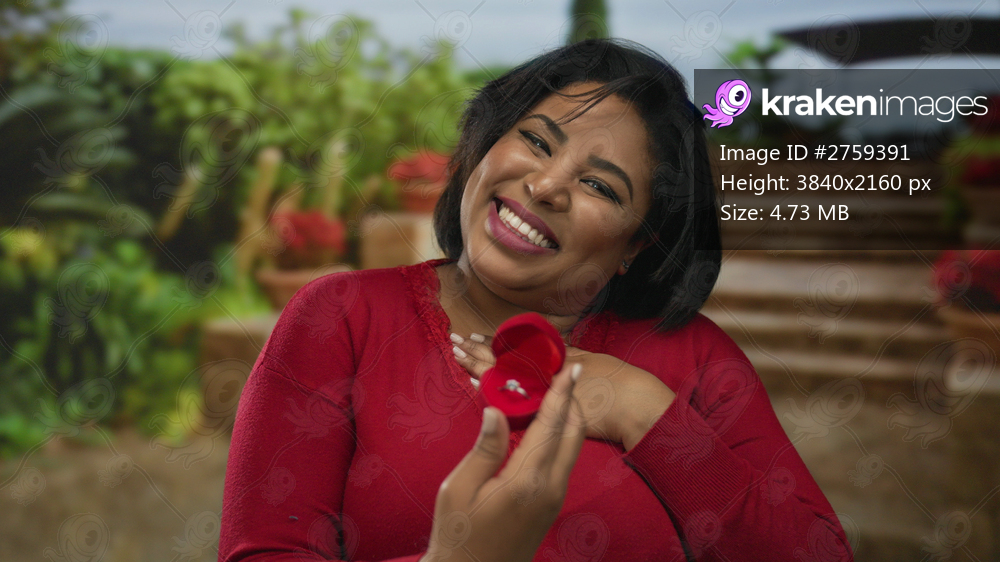Woman in park joyfully holds ring box proposing marriage outdoor latin plus size happy engagement female.