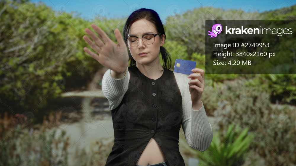 Woman in park outdoors holding credit card gesturing no with hand brunette wearing glasses green background