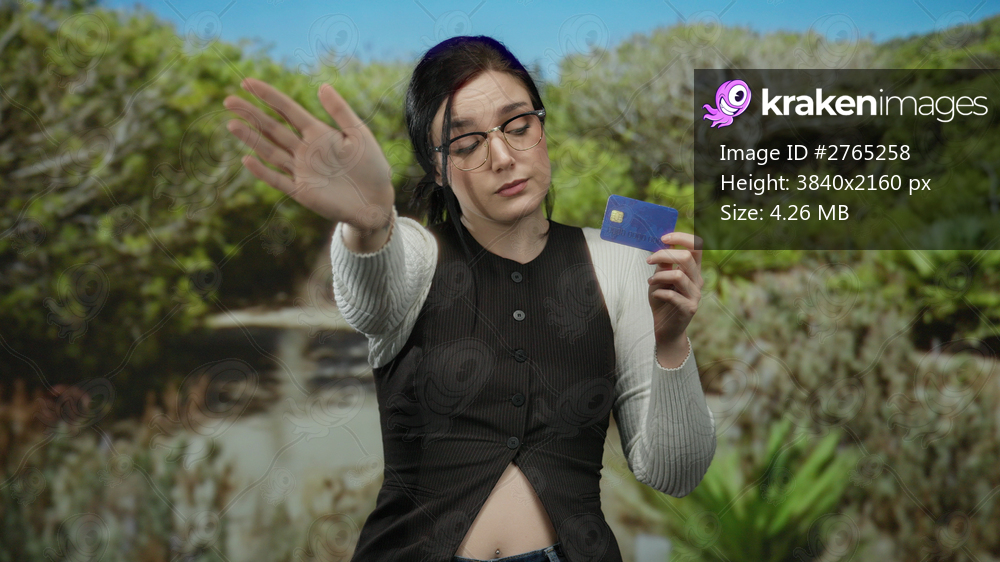Woman in park outdoors holding credit card gesturing no with hand brunette wearing glasses green background