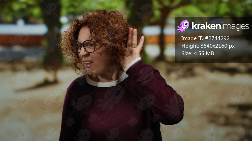 Woman in park outdoors making listening gesture with expression of curiosity and confusion, capturing a moment of interaction with middle aged brunette hispanic female in casual wear. - Kraken Images