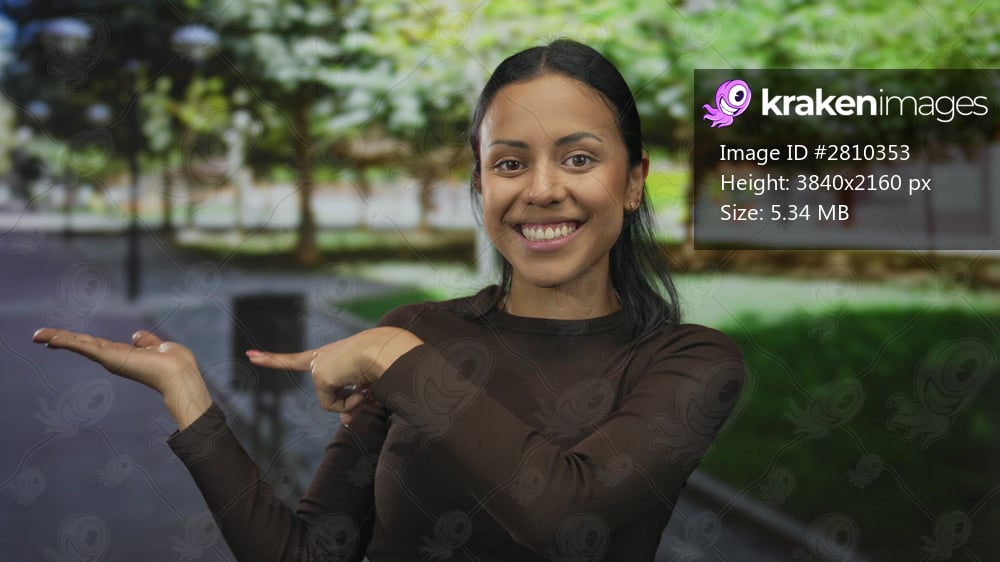 Woman in park showing okay hand gesture, smiling, young, hispanic, outdoors, surrounded by greenery and sunlight, creating a cheerful, vibrant, and positive atmosphere. - Kraken Images