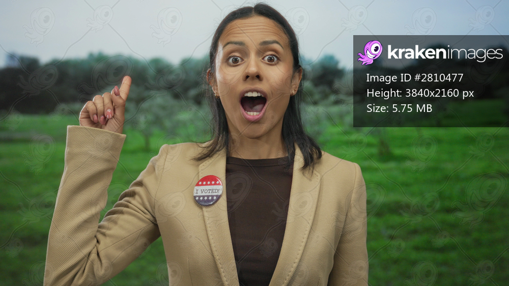 Woman in park smiles with finger raised wearing an i voted badge celebrates outdoors against green park backdrop suggesting civic pride and engagement in the united states. - Kraken Images