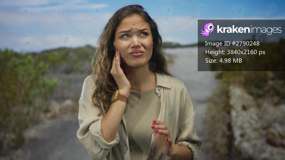 Woman in park sporting a pained expression with hand on cheek suggesting toothache under a bright blue sky surrounded by greenery in a serene outdoor setting. - Kraken Images