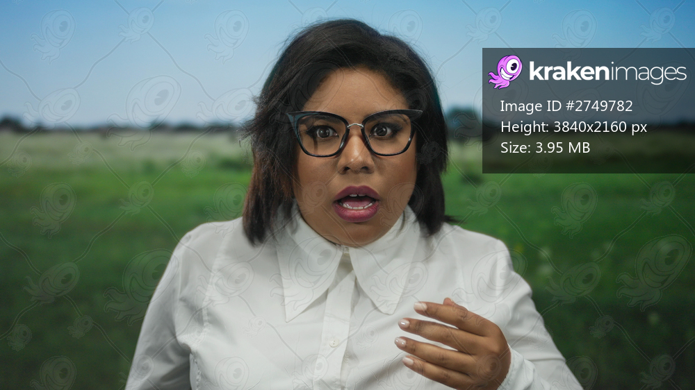 Woman in park with surprised expression, glasses, wearing white shirt, nature background, emotional reaction, young adult, outdoors, green grass, looking astonished. - Kraken Images