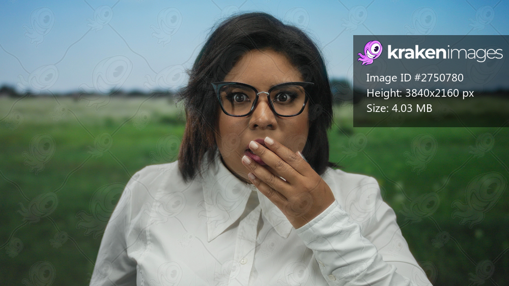 Woman in park with surprised expression, glasses, wearing white shirt, nature background, emotional reaction, young adult, outdoors, green grass, looking astonished. - Kraken Images