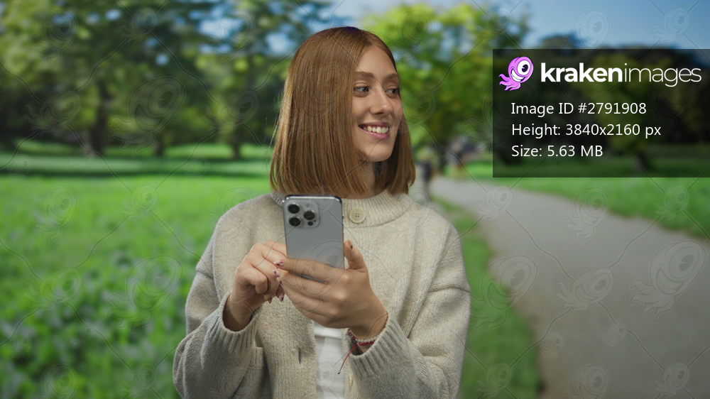 Woman in park uses smartphone with a cheerful smile, surrounded by vibrant greenery and bright sunlight, capturing a moment of digital connection in a natural setting. - Kraken Images