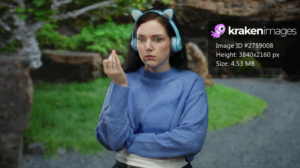 Woman in park wearing blue headphones counting with fingers, featuring brunette hair and casual sweater amidst green outdoor scenery showing a pensive expression. - Kraken Images