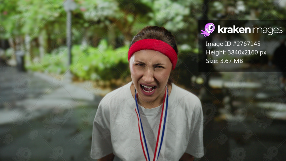 Woman in park wearing medal and headband shouting during outdoor event captured in natural surroundings.