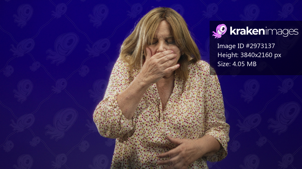Woman in patterned blouse with hand covering mouth and other hand pressed to stomach against blue studio backdrop; nausea discomfort.