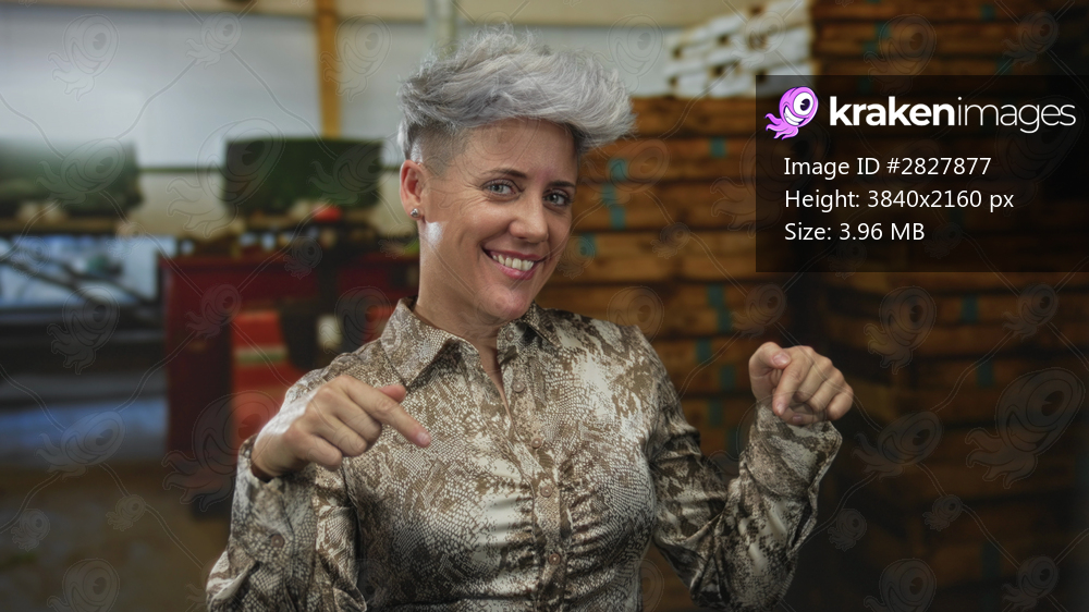 Woman in patterned shirt smiling and pointing fingers at wooden crates in warehouse; invitation focus emphasis engagement.