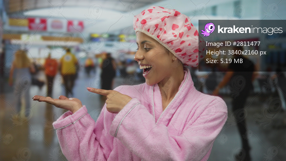 Woman in pink bathrobe smiles and gestures, standing in a vibrant airport terminal setting, highlighting a playful and unexpected travel moment, blending casual style with travel vibe. - Kraken Images