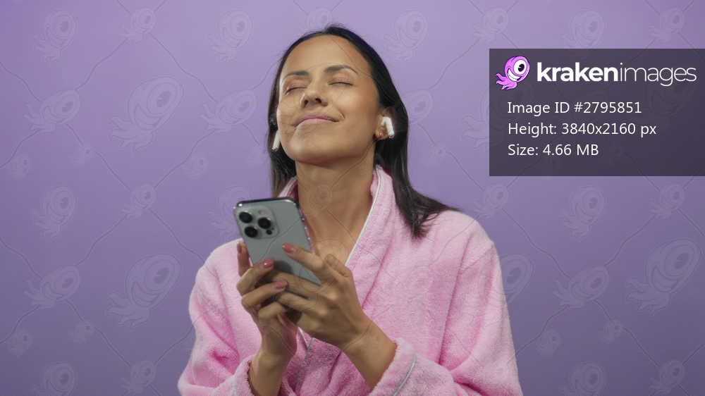 Woman in pink bathrobe using smartphone against purple background looking calm and focused with wireless earbuds in ears enjoying technology in isolation. - Kraken Images