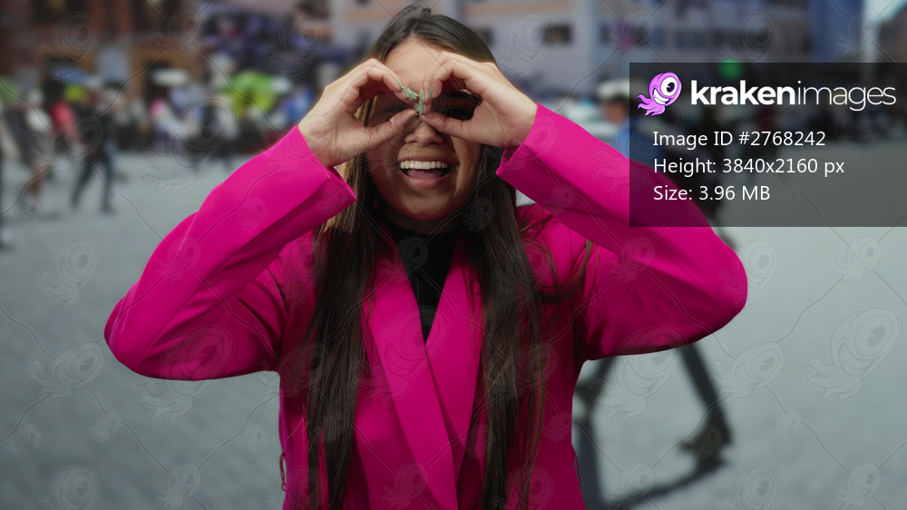 Woman in pink blazer gestures like binoculars with her hands while standing and smiling in a busy street setting filled with people and buildings on a bright day. - Kraken Images