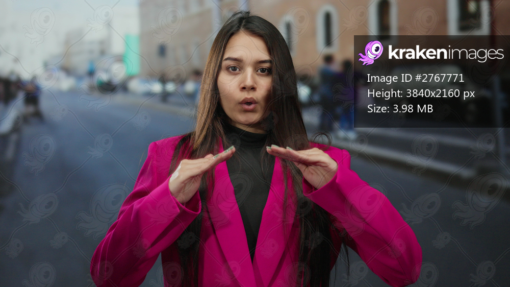 Woman in pink blazer gesturing on busy urban street with blurred background in daylight featuring young hispanic adult outdoors for communication concept - Kraken Images