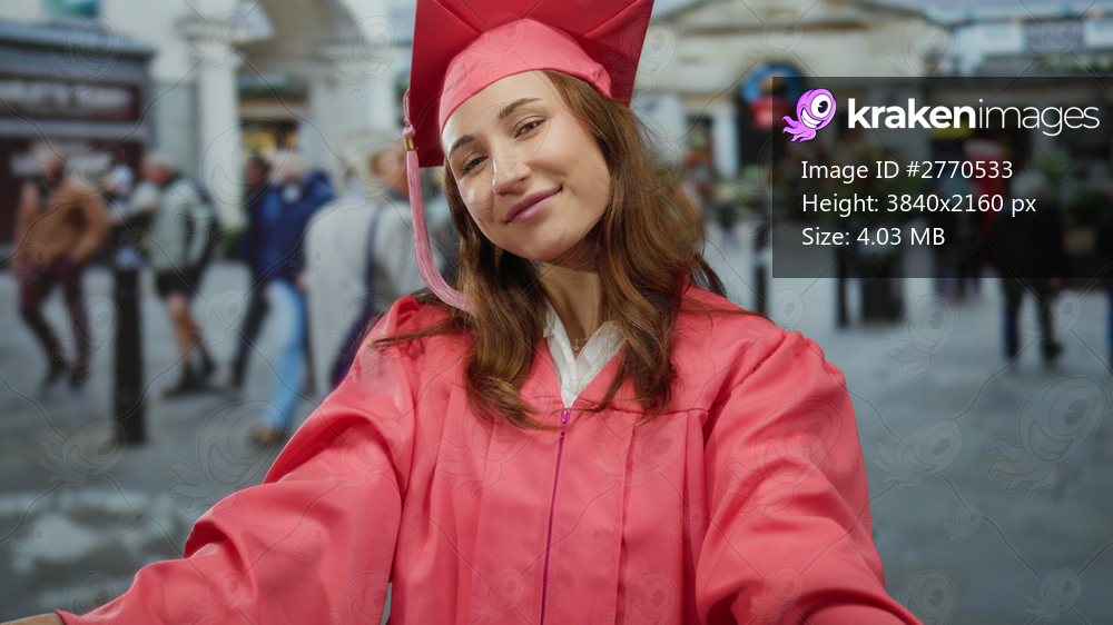 Woman in pink cap and gown celebrating graduation on city street with joyful expression surrounded by urban life and people passing by in background outdoors - Kraken Images