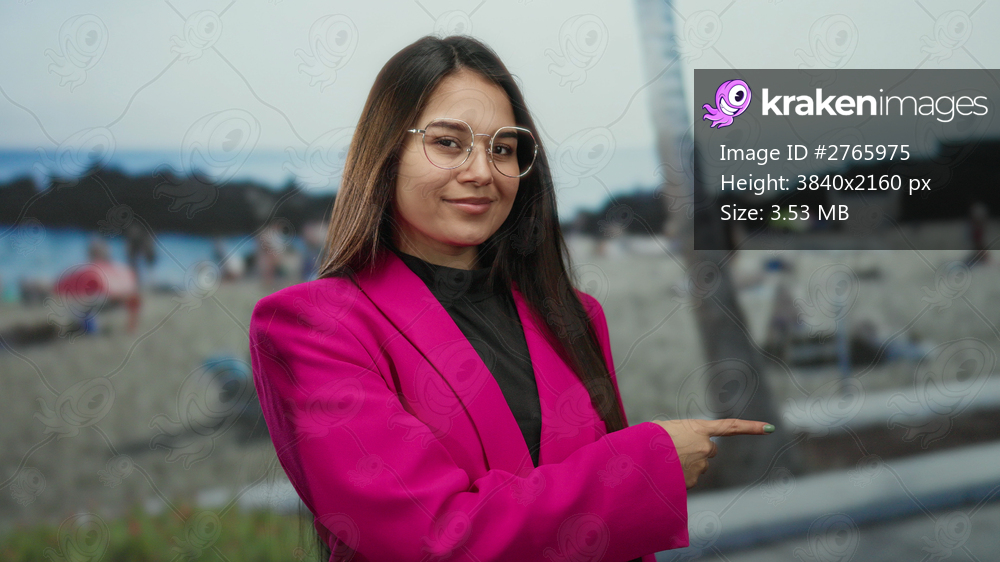 Woman in pink jacket at beach with blurred sea background pointing with expression showcasing plans and thoughts during a seaside work lifestyle.