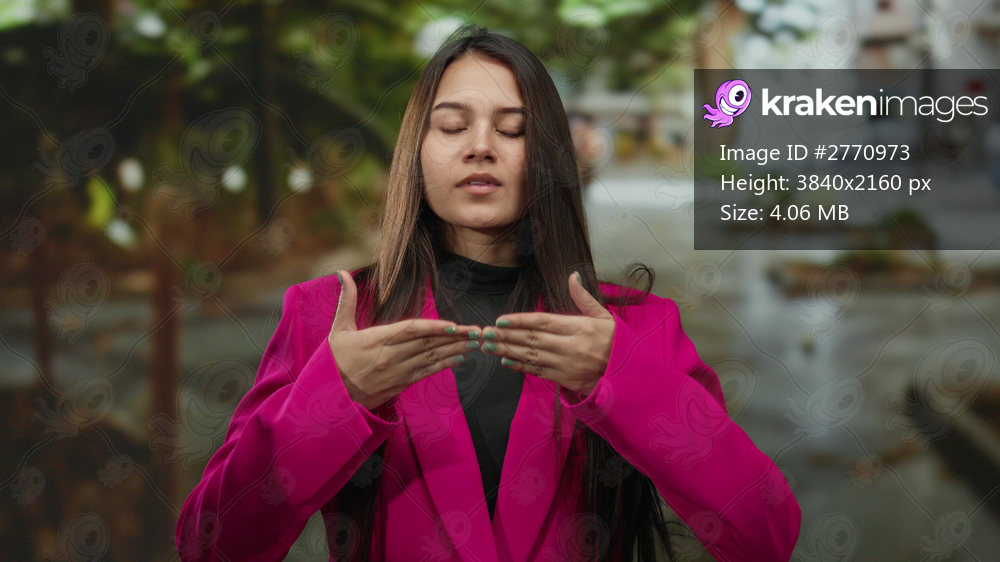Woman in pink jacket gesturing calmly outdoors on a street with a serene expression and long hair, surrounded by a blurred cityscape background during daytime. - Kraken Images