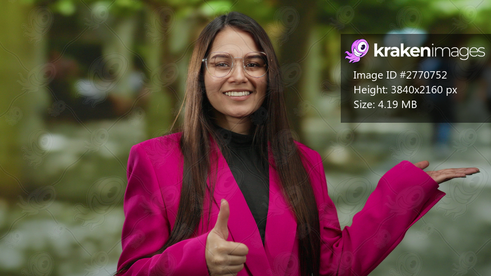 Woman in pink jacket gives thumbs up on a sunny street highlighting positivity and confidence outdoors.