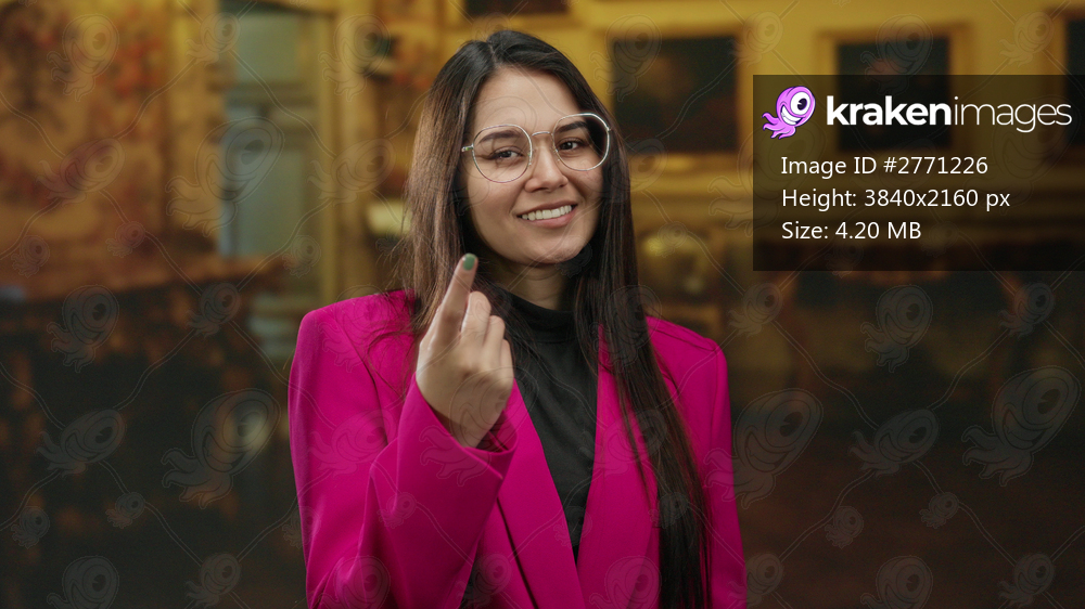 Woman in pink jacket making gesture with finger in art gallery, expressing emotion in stylish indoor space, conveying message with confident expression amid creative surroundings. - Kraken Images
