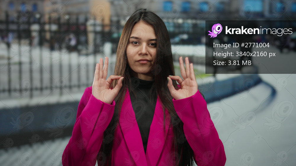 Woman in pink jacket making hand signs on a street with a blurred city background showcasing outdoor urban setting.