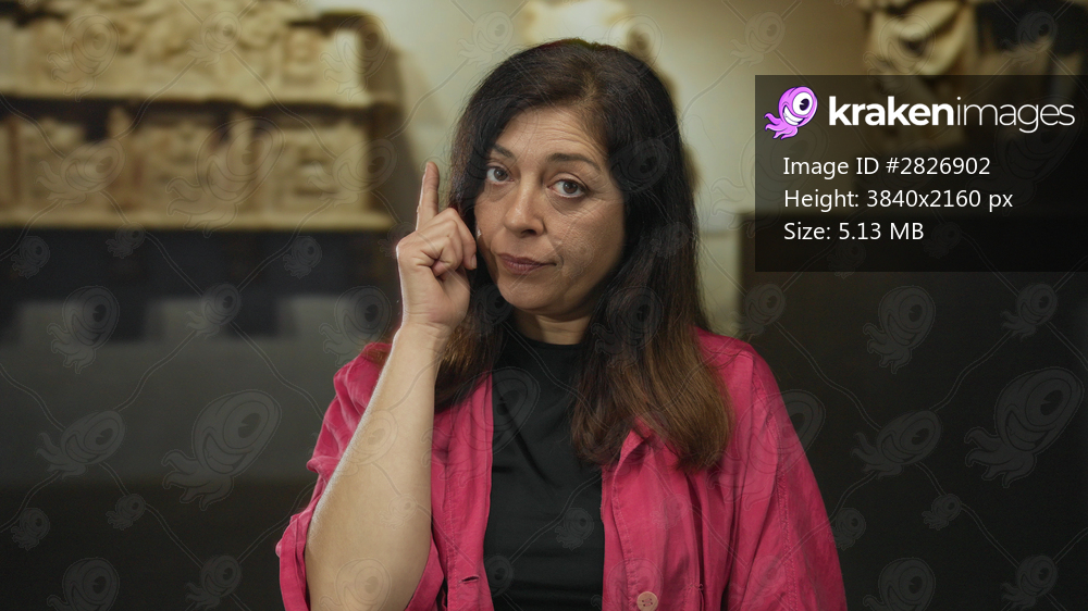 Woman in pink jacket pointing finger and raising finger to temple in museum gallery with serious expression; reflection.