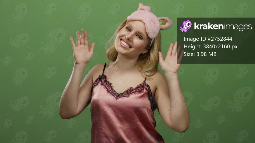 Woman in pink nightwear with a playful eye mask poses against a green background, radiating joy and energetic vibes, creating a lively and fun atmosphere. - Kraken Images