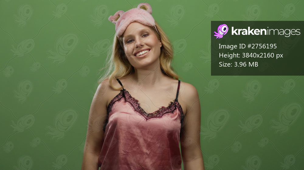 Woman in pink nightwear with a playful eye mask poses against a green background, radiating joy and energetic vibes, creating a lively and fun atmosphere. - Kraken Images
