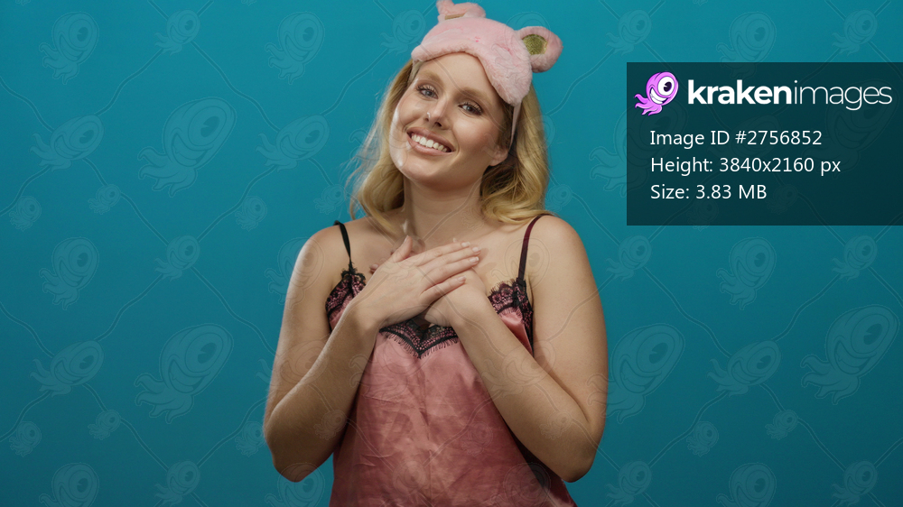 Woman in pink nightwear with sleep mask standing against blue background, showing a content expression with hands on chest.
