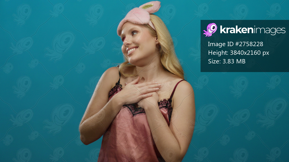 Woman in pink nightwear with sleep mask standing against blue background, showing a content expression with hands on chest.