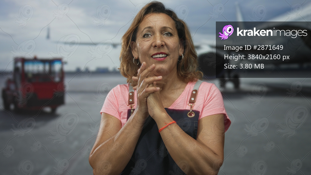 Woman in pink overalls clasping hands at airport terminal tarmac near airplane engine under cloudy sky; hope.