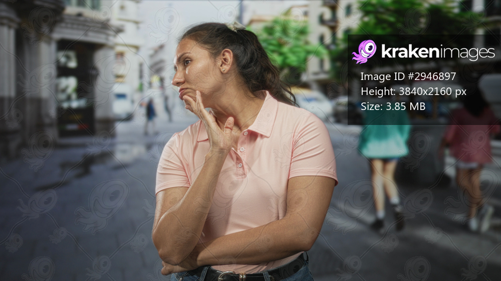 Woman in pink polo with hand on chin pensive pose on busy city street plaza; thoughtful pondering decision making.