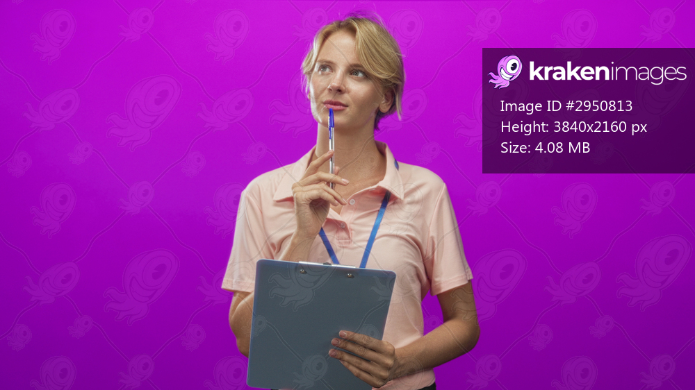 Woman in pink polo holding clipboard and pen, hand to chin in studio with lanyard visible; thoughtful reflection.