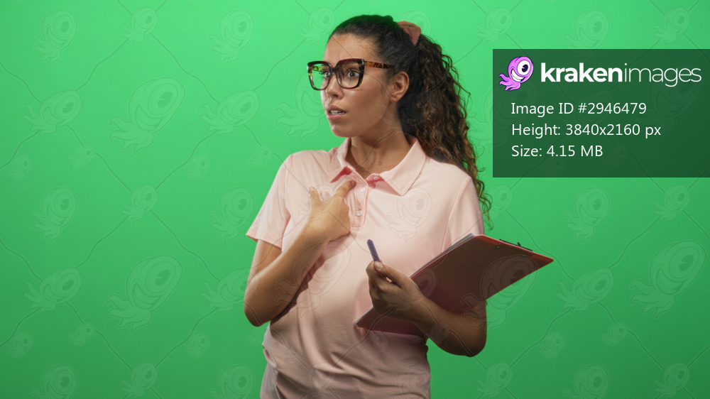 Woman in pink polo shirt wearing glasses points thumb to chest holding clipboard and pen in studio; uncertainty hesitation.