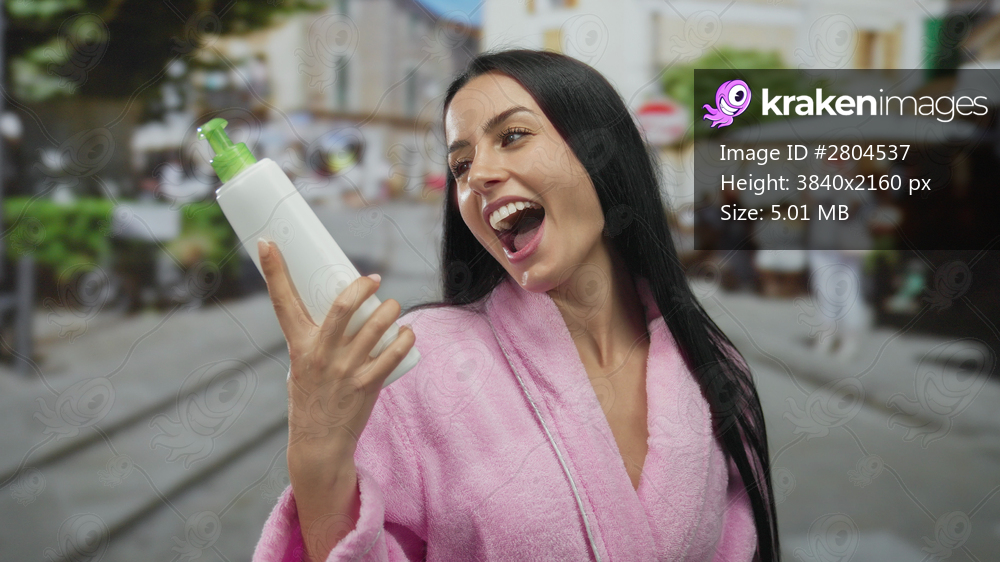 Woman in pink robe smiling and holding a white bottle outdoors, showcasing happiness and vitality in an everyday setting with a scenic backdrop.