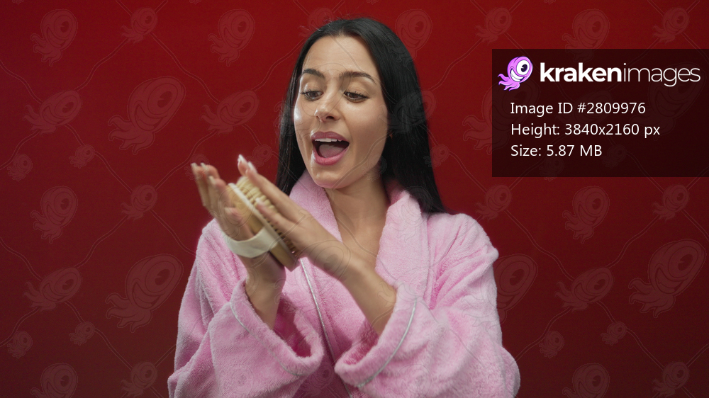 Woman in pink robe using brush against red wall, emphasizing skincare routine and personal wellness, while confidently engaging in a self-care moment