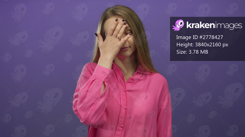 Woman in pink shirt appearing frustrated with eyes closed and hand on face against isolated purple background showcasing emotion and expression over wall - Kraken Images