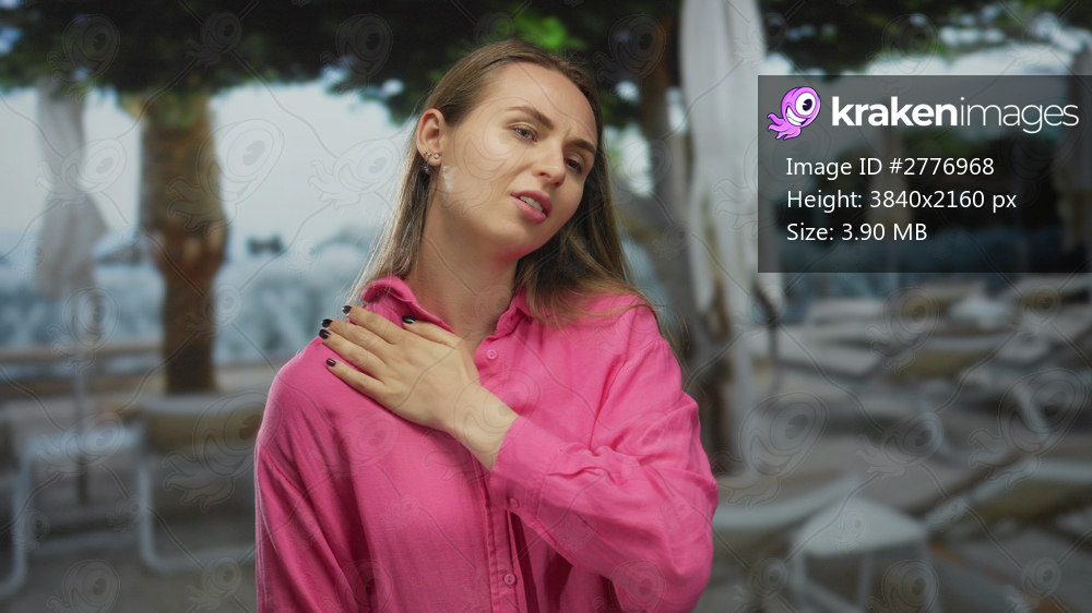 Woman in pink shirt experiences shoulder pain outdoors at a resort pool with palm trees and sun loungers, indicating discomfort and tranquility in a vacation setting. - Kraken Images
