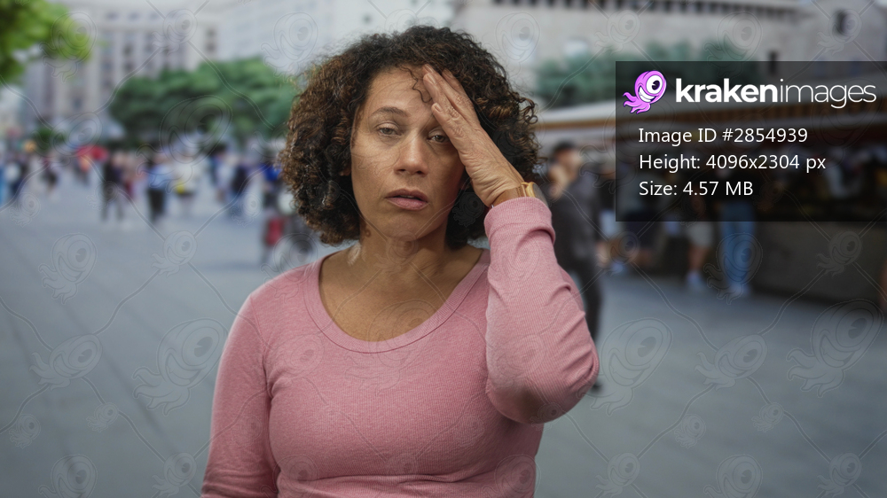 Woman in pink shirt with eyes closed touches forehead amid souvenir stalls at street market; fatigue.