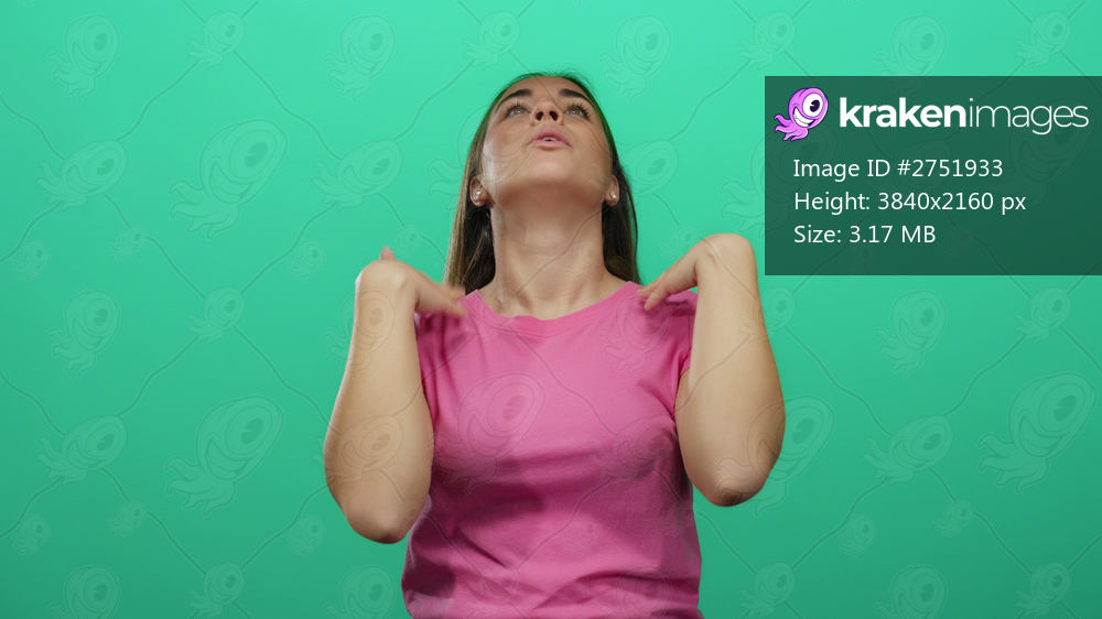 Woman in pink shirt fanning herself in front of an isolated green background, expressing heat and discomfort, her gestures indicating a need to cool down, appearing warm and flustered. - Kraken Images
