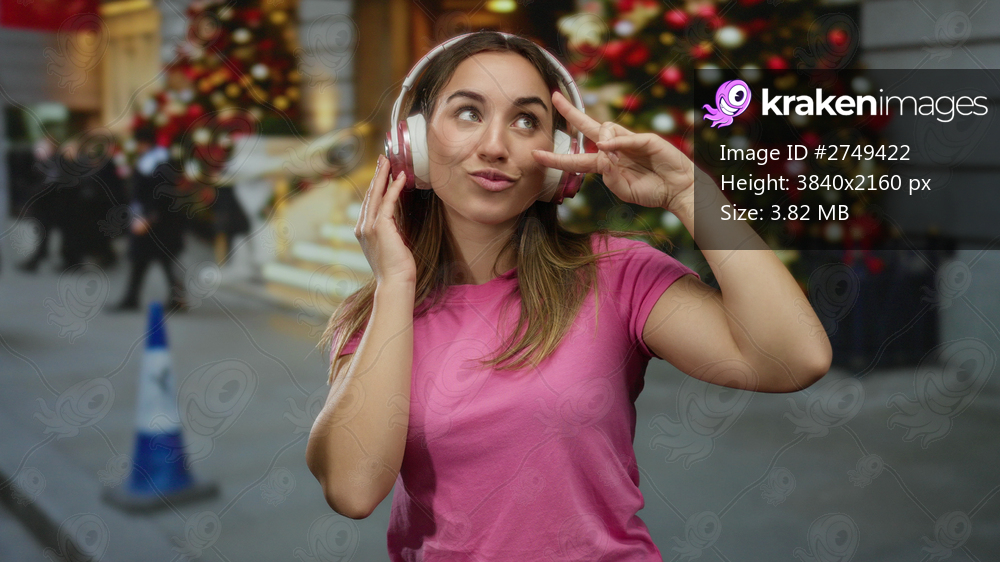 Woman in pink shirt with headphones making peace sign outdoors near holiday decorations on a street.