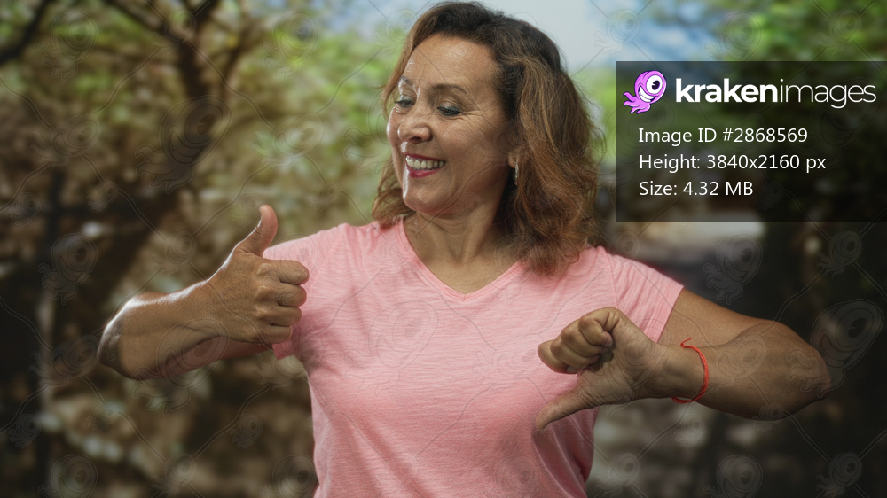 Woman in pink shirt holds thumbs up with left hand and thumbs down with right hand on forest path; ambivalence.