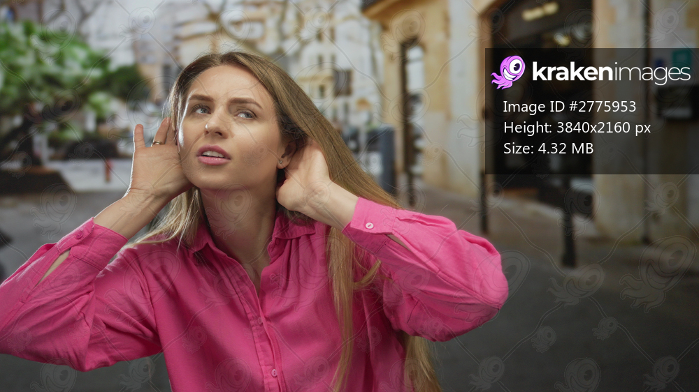 Woman in pink shirt listening intently on a vibrant city street with background blur, capturing urban energy and curiosity in an outdoor urban setting. - Kraken Images