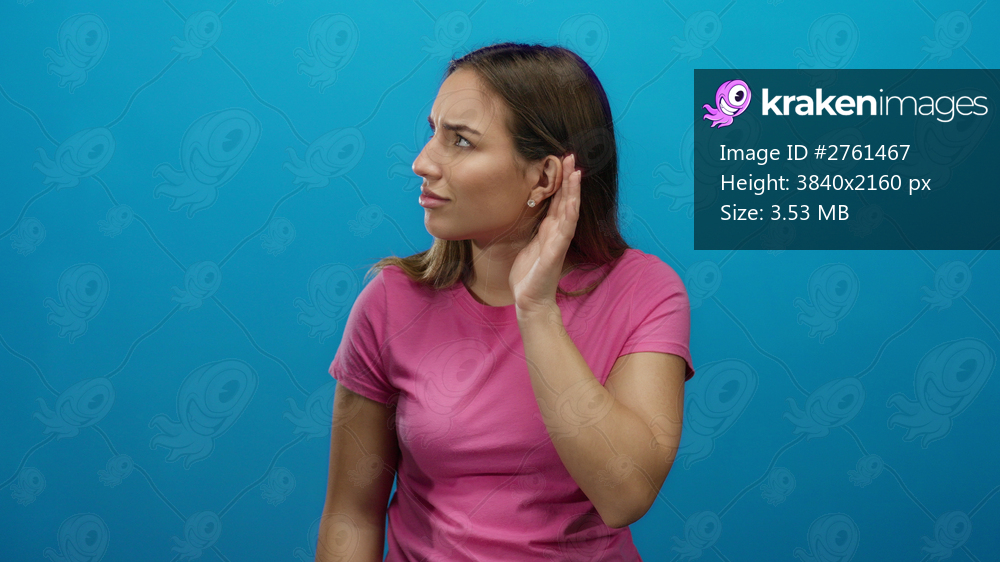 Woman in pink shirt listens with hand to ear against blue background showing curiosity and interest in isolated studio setting.